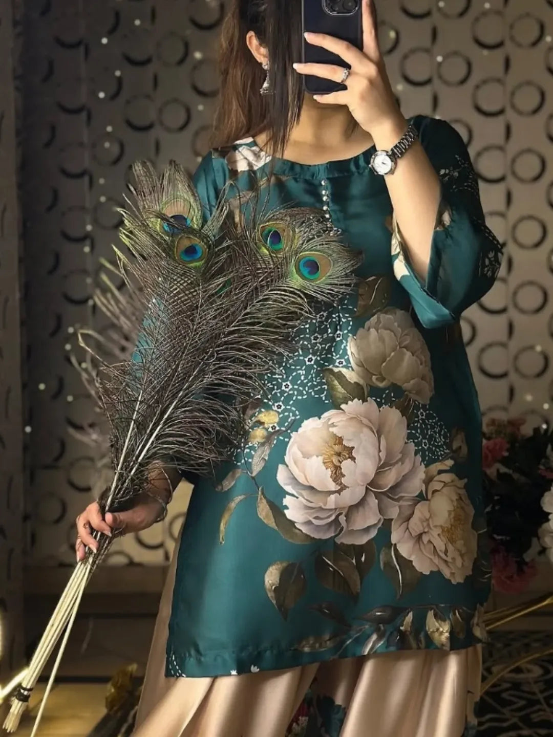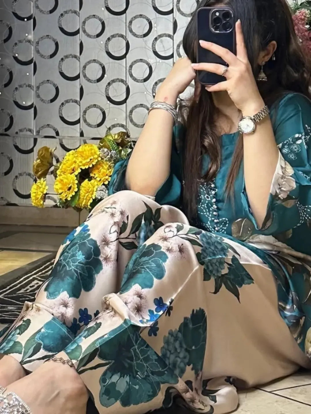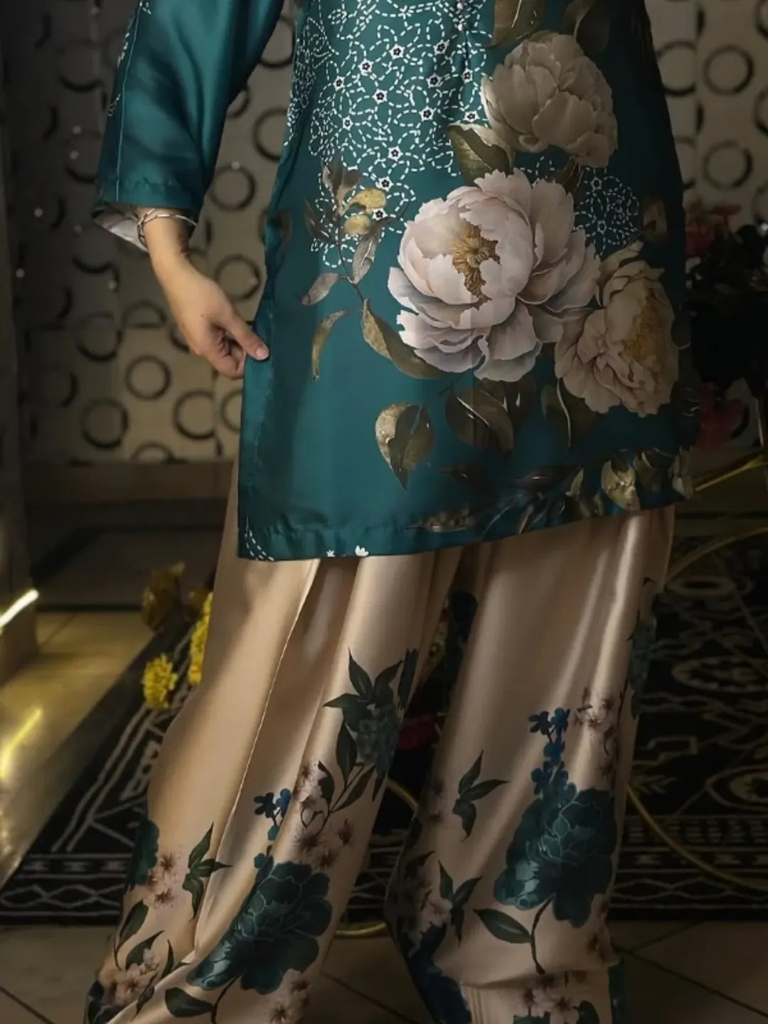 Elegant Printed 2-Piece Suit - Teal & Beige Light weight & comfortable fabric Trendy floral digital print mid-season & winter friendly Party wear, get-togethers aur casual outings ke liye ideal